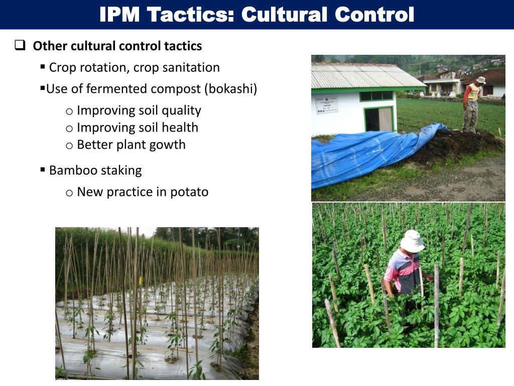 IPM Tactics: Cultural Control • Other cultural control tactics • Crop rotation, crop sanitation • Use of fermented compost (bokashi) • Improving soil quality • Improving soil health • Better plant gowth • Bamboo staking • New practice in potato