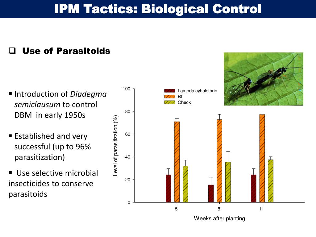 IPM Tactics: Biological Control • Use of Parasitoids • Introduction of Diadegma • semiclausum to control • DBM in early 1950s • Established and very • successful (up to 96% • parasitization) • Use selective microbial insecticides to conserve parasitoids