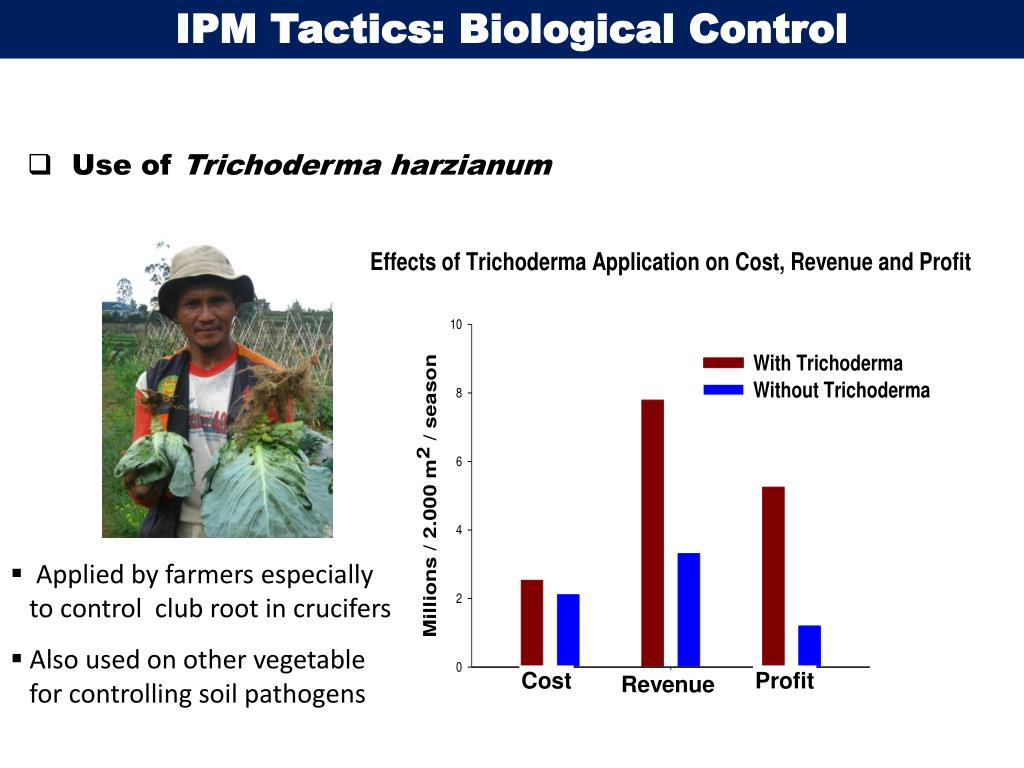 IPM Tactics: Biological Control • Use of Trichodermaharzianum • Applied by farmers especially • to control club root in crucifers • Also used on other vegetable • for controlling soil pathogens