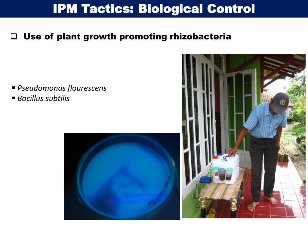IPM Tactics: Biological Control • Use of plant growth promoting rhizobacteria • Pseudomonas flourescens • Bacillus subtilis