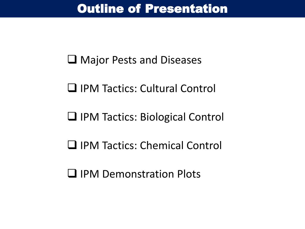 Outline of Presentation • Major Pests and Diseases • IPM Tactics: Cultural Control • IPM Tactics: Biological Control • IPM Tactics: Chemical Control • IPM Demonstration Plots