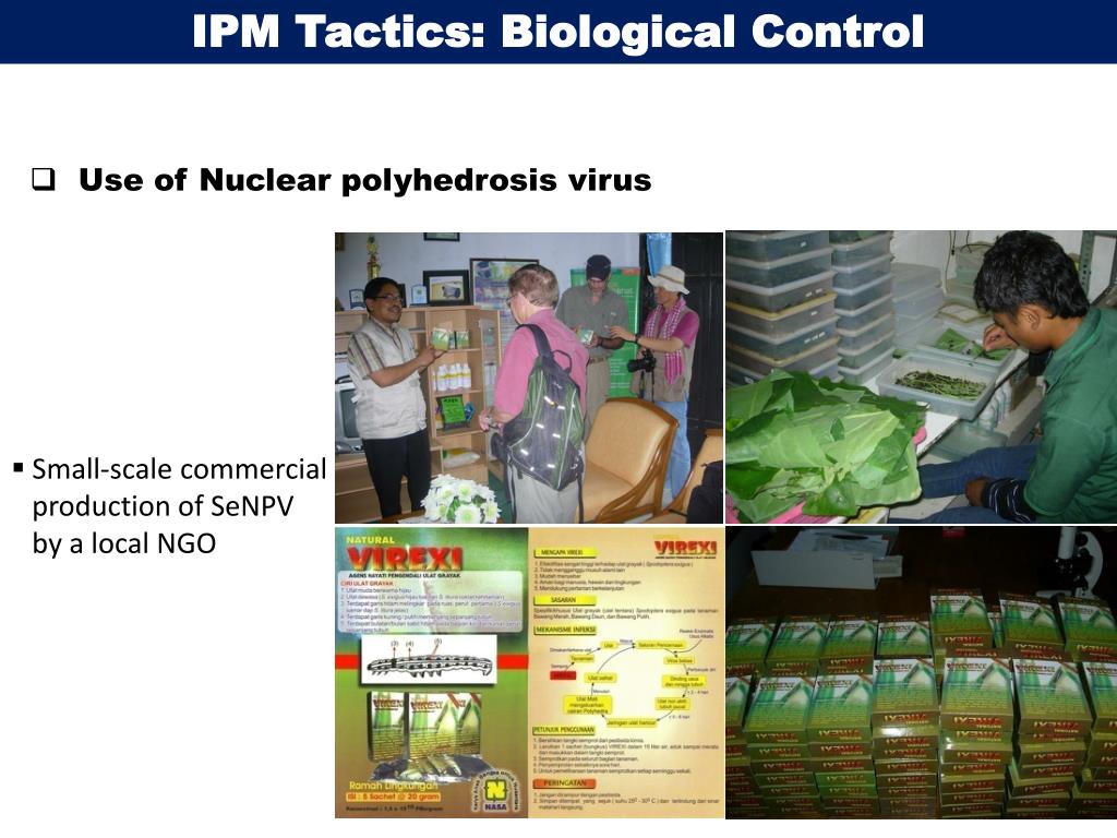 IPM Tactics: Biological Control • Use of Nuclear polyhedrosis virus • Small-scale commercial • production of SeNPV • by a local NGO