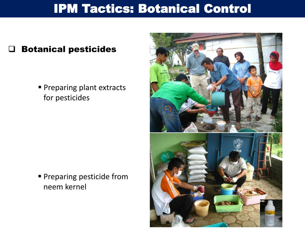IPM Tactics: Botanical Control • Botanical pesticides • Preparing plant extracts • for pesticides • Preparing pesticide from • neem kernel