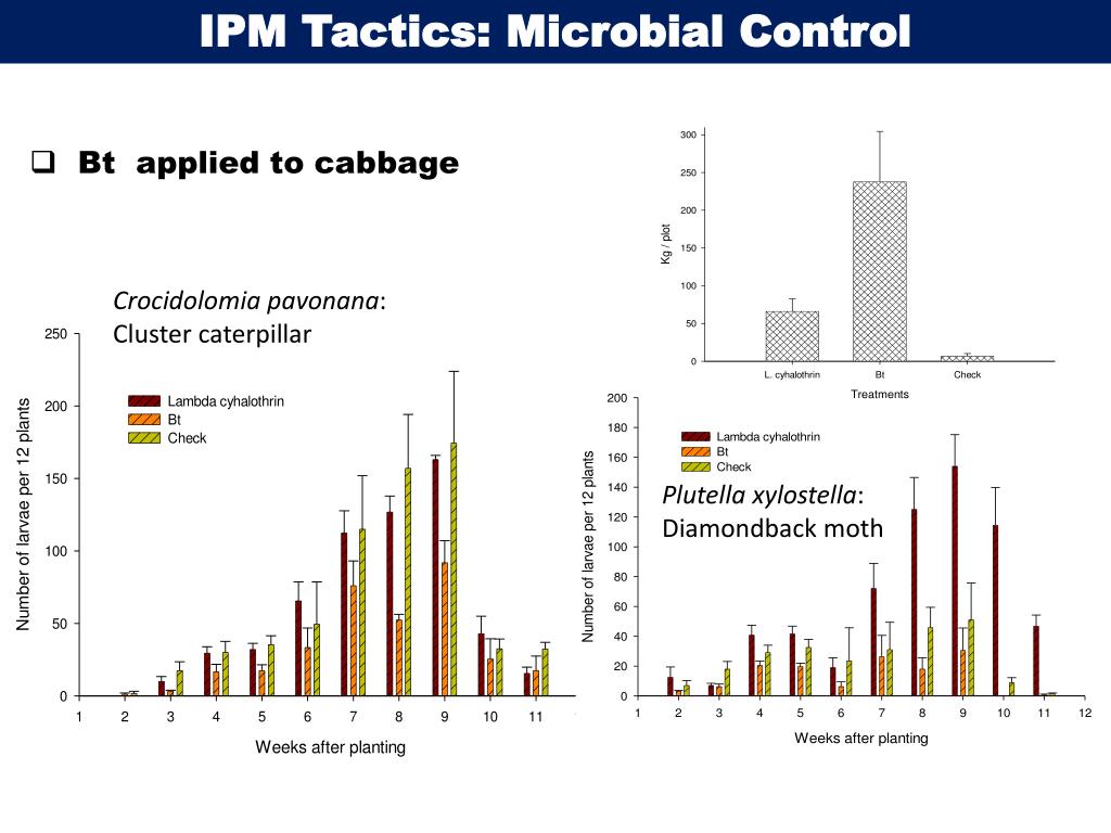 IPM Tactics: Microbial Control • Bt applied to cabbage Crocidolomiapavonana: Cluster caterpillar Plutellaxylostella: Diamondback moth