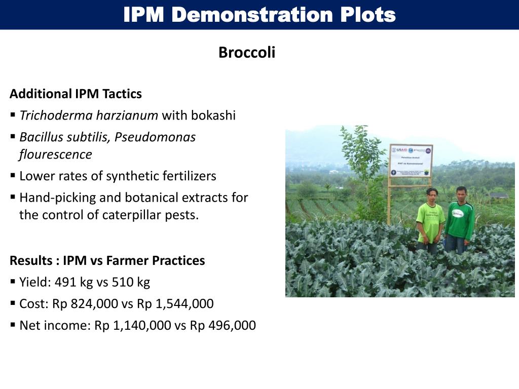 IPM Demonstration Plots Broccoli • Additional IPM Tactics • Trichodermaharzianum with bokashi • Bacillus subtilis, Pseudomonas • flourescence • Lower rates of synthetic fertilizers • Hand-picking and botanical extracts for • the control of caterpillar pests. • Results : IPM vs Farmer Practices • Yield: 491 kg vs 510 kg • Cost: Rp 824,000 vsRp 1,544,000 • Net income: Rp 1,140,000 vsRp 496,000