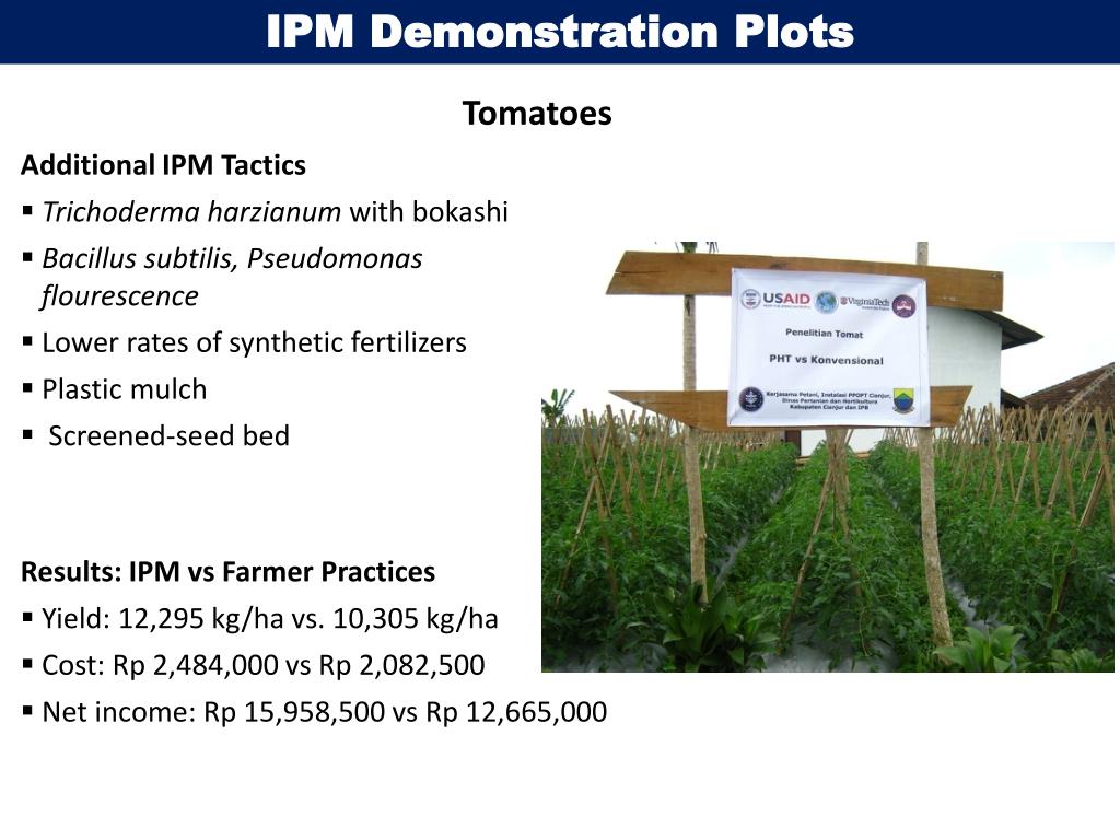 IPM Demonstration Plots Tomatoes • Additional IPM Tactics • Trichodermaharzianum with bokashi • Bacillus subtilis, Pseudomonas • flourescence • Lower rates of synthetic fertilizers • Plastic mulch • Screened-seed bed • Results: IPM vs Farmer Practices • Yield: 12,295 kg/ha vs. 10,305 kg/ha • Cost: Rp 2,484,000 vsRp 2,082,500 • Net income: Rp 15,958,500 vsRp 12,665,000