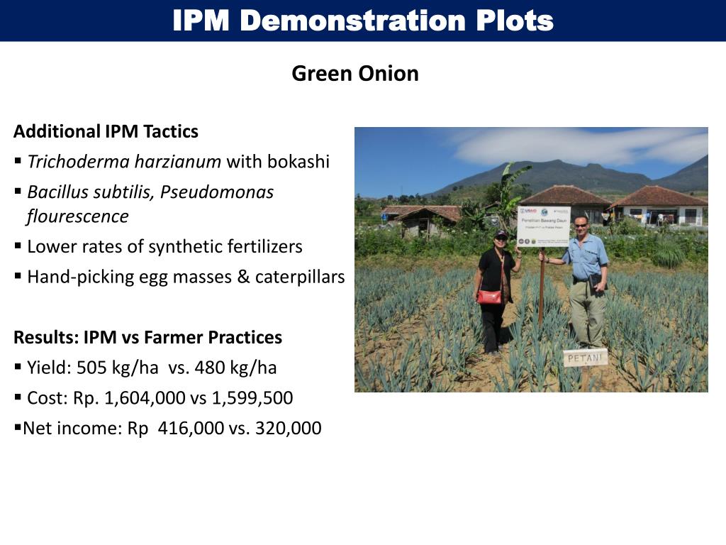 IPM Demonstration Plots Green Onion • Additional IPM Tactics • Trichodermaharzianum with bokashi • Bacillus subtilis, Pseudomonas • flourescence • Lower rates of synthetic fertilizers • Hand-picking egg masses & caterpillars • Results: IPM vs Farmer Practices • Yield: 505 kg/ha vs. 480 kg/ha • Cost: Rp. 1,604,000 vs 1,599,500 • Net income: Rp 416,000 vs. 320,000