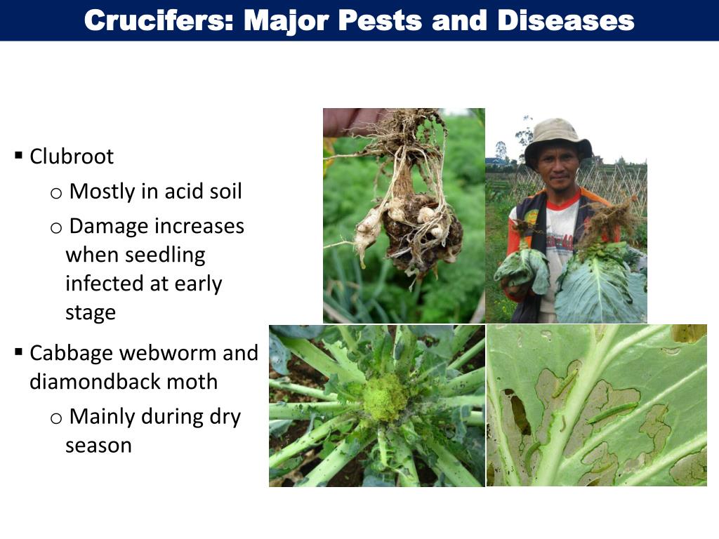 Crucifers: Major Pests and Diseases • Clubroot • Mostly in acid soil • Damage increases • when seedling • infected at early • stage • Cabbage webworm and • diamondback moth • Mainly during dry • season