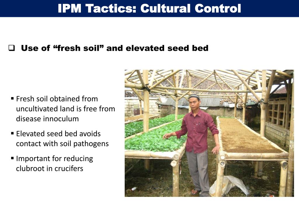 IPM Tactics: Cultural Control • Use of “fresh soil” and elevated seed bed • Fresh soil obtained from • uncultivated land is free from • disease innoculum • Elevated seed bed avoids • contact with soil pathogens • Important for reducing • clubroot in crucifers