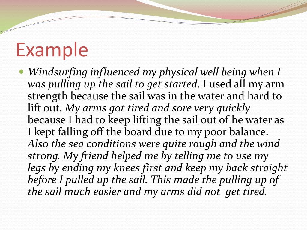 Example • Windsurfing influenced my physical well being when I was pulling up the sail to get started. I used all my arm strength because the sail was in the water and hard to lift out. My arms got tired and sore very quickly because I had to keep lifting the sail out of he water as I kept falling off the board due to my poor balance. Also the sea conditions were quite rough and the wind strong. My friend helped me by telling me to use my legs by ending my knees first and keep my back straight before I pulled up the sail. This made the pulling up of the sail much easier and my arms did not get tired.