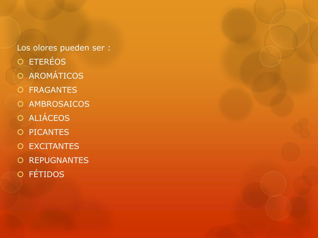 Los olores pueden ser : • ETERÉOS • AROMÁTICOS • FRAGANTES • AMBROSAICOS • ALIÁCEOS • PICANTES • EXCITANTES • REPUGNANTES • FÉTIDOS