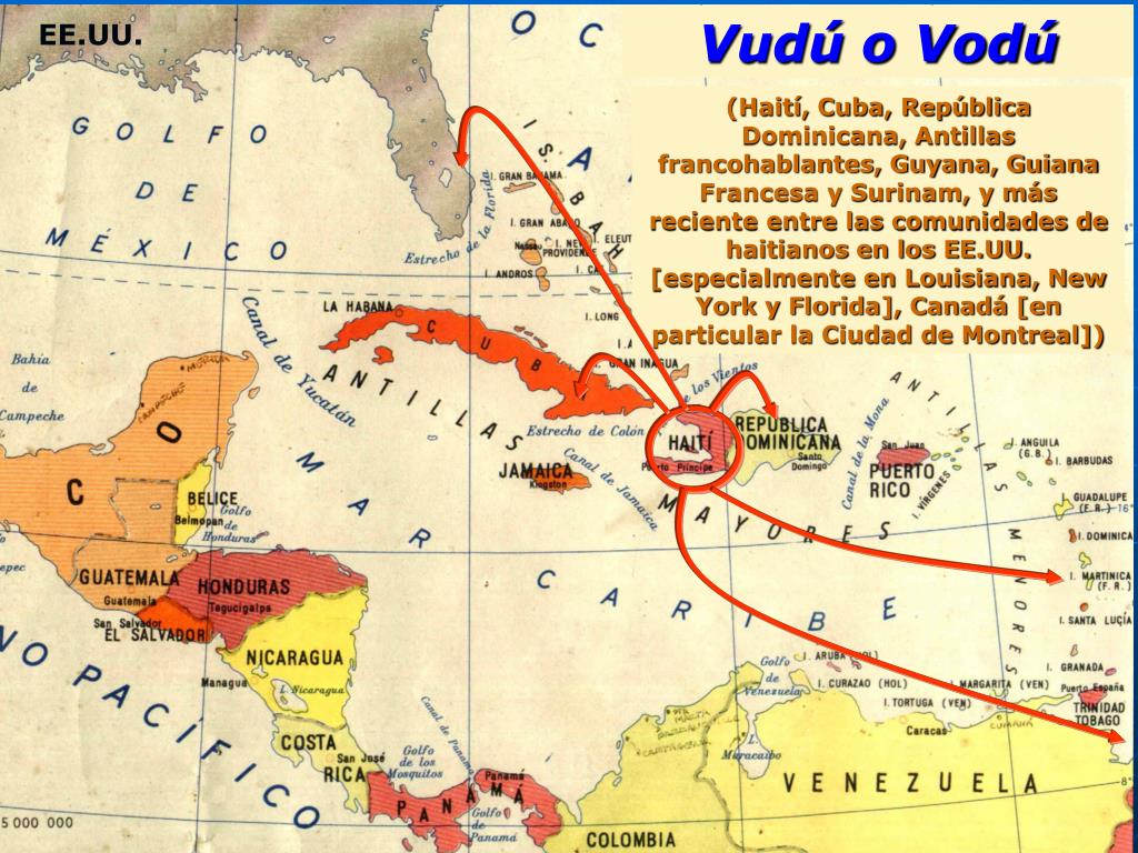 EE.UU. Vudú o Vodú (Haití, Cuba, República Dominicana, Antillas francohablantes, Guyana, Guiana Francesa y Surinam, y más reciente entre las comunidades de haitianos en los EE.UU. [especialmente en Louisiana, New York y Florida], Canadá [en particular la Ciudad de Montreal])