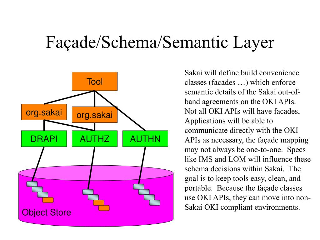 Façade/Schema/Semantic Layer Sakai will define build convenience classes (facades …) which enforce semantic details of the Sakai out-of-band agreements on the OKI APIs. Not all OKI APIs will have facades, Applications will be able to communicate directly with the OKI APIs as necessary, the façade mapping may not always be one-to-one. Specs like IMS and LOM will influence these schema decisions within Sakai. The goal is to keep tools easy, clean, and portable. Because the façade classes use OKI APIs, they can move into non-Sakai OKI compliant environments. Tool org.sakai org.sakai DRAPI AUTHZ AUTHN Object Store