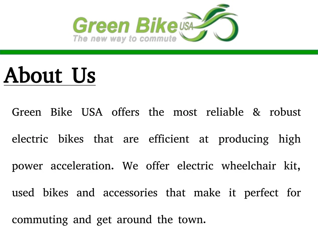 About Us Green Bike USA offers the most reliable & robust electric bikes that are efficient at producing high power acceleration. We offer electric wheelchair kit, used bikes and accessories that make it perfect for commuting and get around the town.