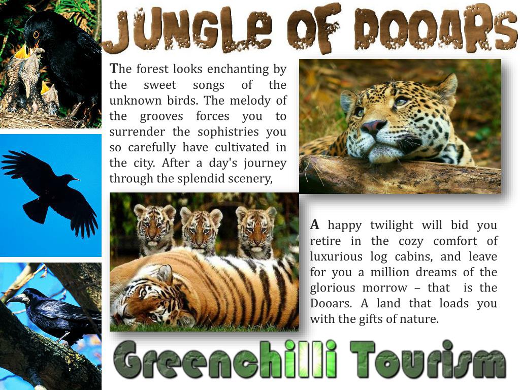 Nature of Dooars Dooars, part of the North Bengal, is an extremely adventurous destination with choices for all niches of travelers. From exploring the unfamiliar jungles of Gorumara to hanging around with tigers at Buxa Tiger Reserve – the jungles here offer exciting options. One can also choose to take a Dooars Jungle Tour and spot all the mysterious trees and birds around the region with occasional views of wild animals. Dooars is one of the very few places left in the country where nature is so lavish of her green facilities. The unending stretches of virgin forests are cress-crossed by the River Teesta and her innumerable tributaries. Looking like molten silver against their setting sun, beautiful motor able roads cut through the deep forests, rich with wild life; mauve hills stand at the end of graceful plains.