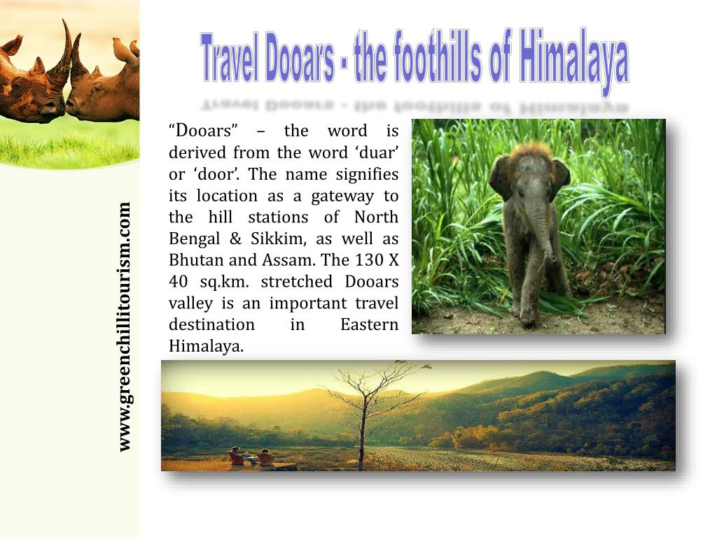 Travel Dooars - the foothills of Himalaya “Dooars” – the word is derived from the word ‘duar’ or ‘door’. The name signifies its location as a gateway to the hill stations of North Bengal & Sikkim, as well as Bhutan and Assam. The 130 X 40 sq.km. stretched Dooars valley is an important travel destination in Eastern Himalaya. www.greenchillitourism.com