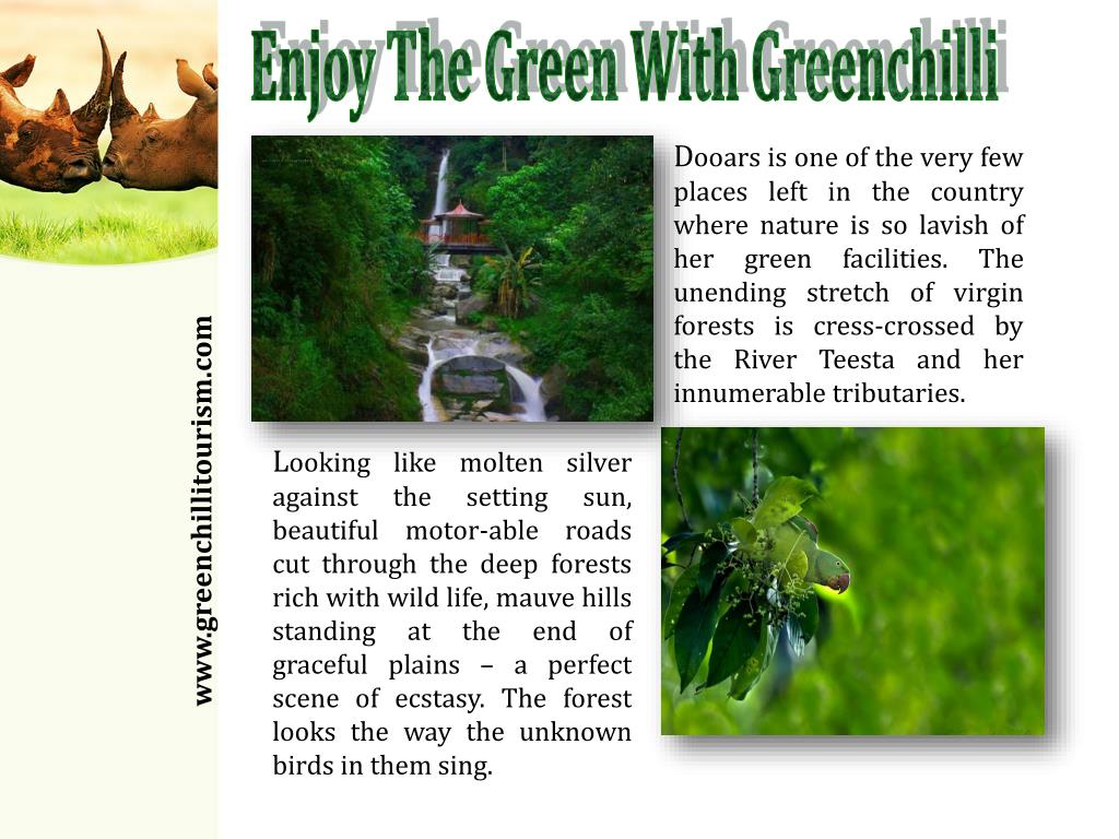 Enjoy The Green With Greenchilli Dooars is one of the very few places left in the country where nature is so lavish of her green facilities. The unending stretch of virgin forests is cress-crossed by the River Teesta and her innumerable tributaries. Looking like molten silver against the setting sun, beautiful motor-able roads cut through the deep forests rich with wild life, mauve hills standing at the end of graceful plains – a perfect scene of ecstasy. The forest looks the way the unknown birds in them sing. www.greenchillitourism.com