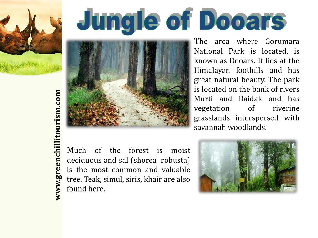 Jungle of Dooars The area where Gorumara National Park is located, is known as Dooars. It lies at the Himalayan foothills and has great natural beauty. The park is located on the bank of rivers Murti and Raidak and has vegetation of riverine grasslands interspersed with savannah woodlands. www.greenchillitourism.com Much of the forest is moist deciduous and sal (shorea robusta) is the most common and valuable tree. Teak, simul, siris, khair are also found here.