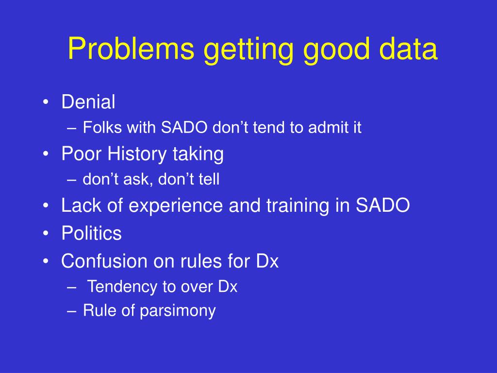Problems getting good data • Denial • Folks with SADO don’t tend to admit it • Poor History taking • don’t ask, don’t tell • Lack of experience and training in SADO • Politics • Confusion on rules for Dx • Tendency to over Dx • Rule of parsimony