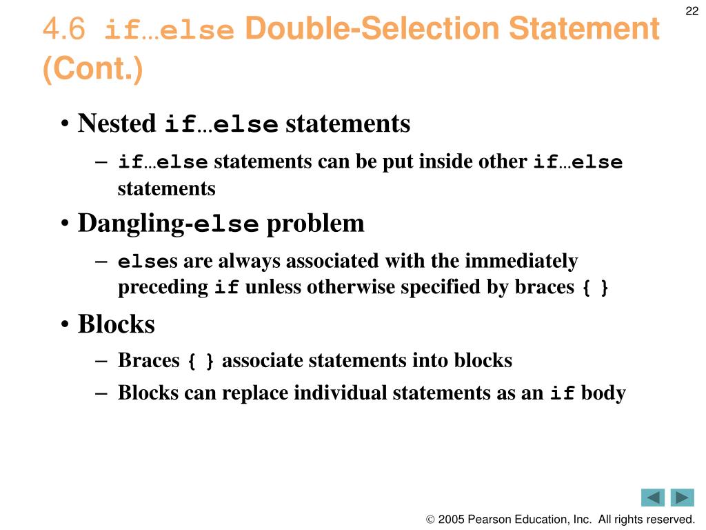 4.6 if…else Double-Selection Statement (Cont.) • Nested if…else statements • if…else statements can be put inside other if…else statements • Dangling-else problem • elses are always associated with the immediately preceding if unless otherwise specified by braces {} • Blocks • Braces {} associate statements into blocks • Blocks can replace individual statements as an if body