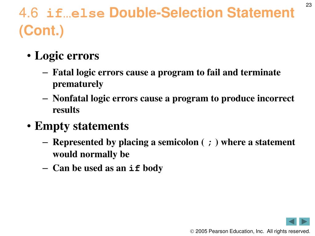 4.6 if…else Double-Selection Statement (Cont.) • Logic errors • Fatal logic errors cause a program to fail and terminate prematurely • Nonfatal logic errors cause a program to produce incorrect results • Empty statements • Represented by placing a semicolon ( ; ) where a statement would normally be • Can be used as an if body