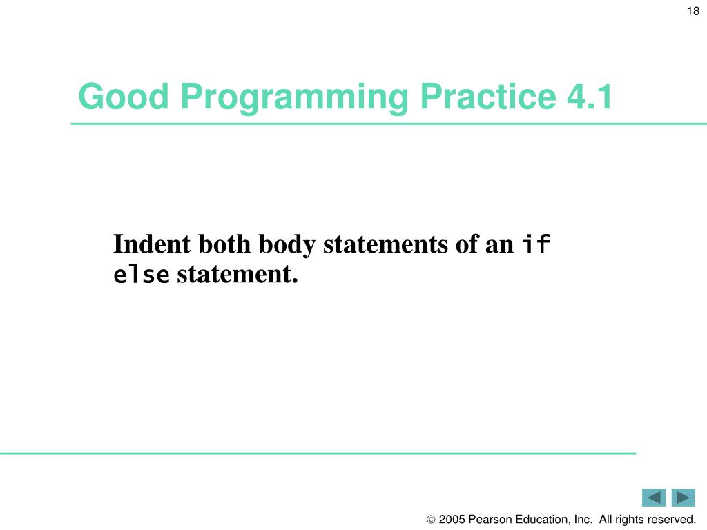 Good Programming Practice 4.1 • Indent both body statements of an if else statement.