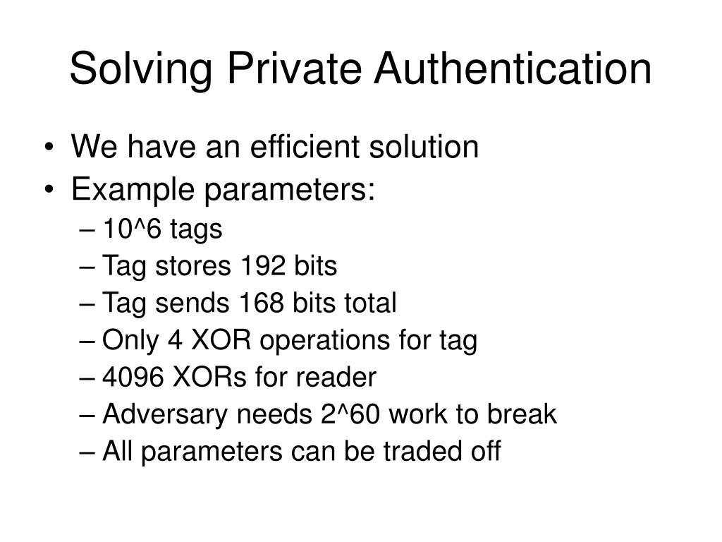 Solving Private Authentication • We have an efficient solution • Example parameters: • 10^6 tags • Tag stores 192 bits • Tag sends 168 bits total • Only 4 XOR operations for tag • 4096 XORs for reader • Adversary needs 2^60 work to break • All parameters can be traded off