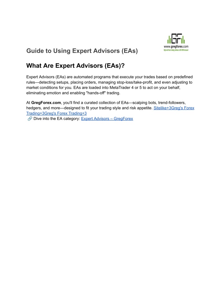 Guide to Using Expert Advisors (EAs) What Are Expert Advisors (EAs)? Expert Advisors (EAs) are automated programs that execute your trades based on predefined rules—detecting setups, placing orders, managing stop-loss/take-profit, and even adjusting to market conditions for you. EAs are loaded into MetaTrader 4 or 5 to act on your behalf, eliminating emotion and enabling "hands-off" trading. At GregForex.com, you'll find a curated collection of EAs—scalping bots, trend-followers, hedgers, and more—designed to fit your trading style and risk appetite. Sitelike+3Greg's Forex Trading+3Greg's Forex Trading+3 ? Dive into the EA category: Expert Advisors – GregForex