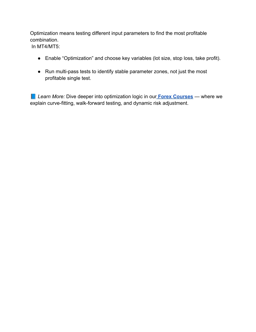 3. Optimization means testing different input parameters to find the most profitable combination. In MT4/MT5: ● Enable “Optimization” and choose key variables (lot size, stop loss, take profit). ● Run multi-pass tests to identify stable parameter zones, not just the most profitable single test. ?Learn More: Dive deeper into optimization logic in ourForex Courses — where we explain curve-fitting, walk-forward testing, and dynamic risk adjustment.