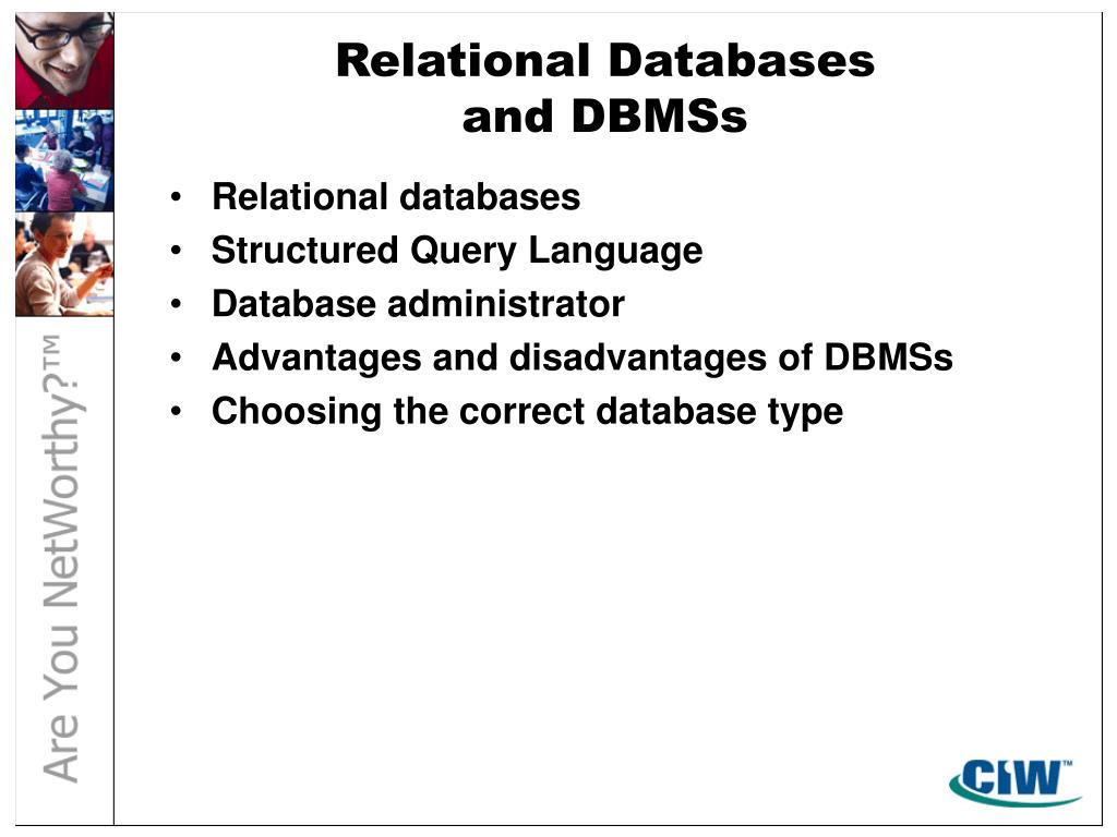 Relational Databasesand DBMSs • Relational databases • Structured Query Language • Database administrator • Advantages and disadvantages of DBMSs • Choosing the correct database type