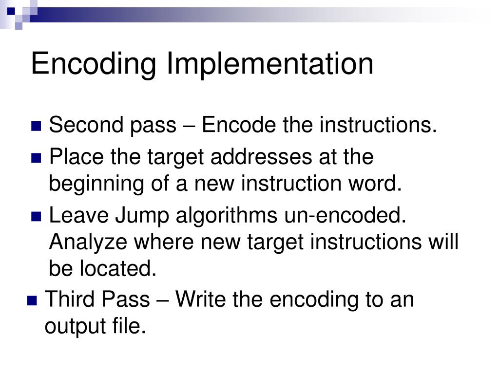 Encoding Implementation • Second pass – Encode the instructions. • Place the target addresses at the beginning of a new instruction word. • Leave Jump algorithms un-encoded. Analyze where new target instructions will be located. • Third Pass – Write the encoding to an output file.
