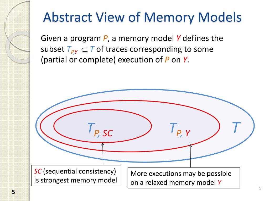 Abstract View of Memory Models Given a program P, a memory model Y defines the subset TP,Y T of traces corresponding to some (partial or complete) execution of P on Y. TP, SC TP, Y T SC (sequential consistency) Is strongest memory model More executions may be possible on a relaxed memory model Y 5