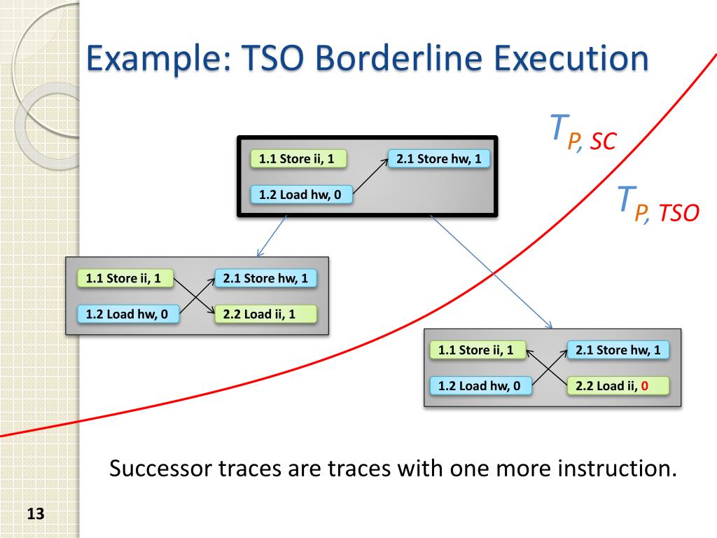 Example: TSO Borderline Execution TP, SC 1.1 Store ii, 1 2.1 Store hw, 1 TP, TSO 1.2 Load hw, 0 1.1 Store ii, 1 2.1 Store hw, 1 1.2 Load hw, 0 2.2 Load ii, 1 1.1 Store ii, 1 2.1 Store hw, 1 1.2 Load hw, 0 2.2 Load ii, 0 • Successor traces are traces with one more instruction.