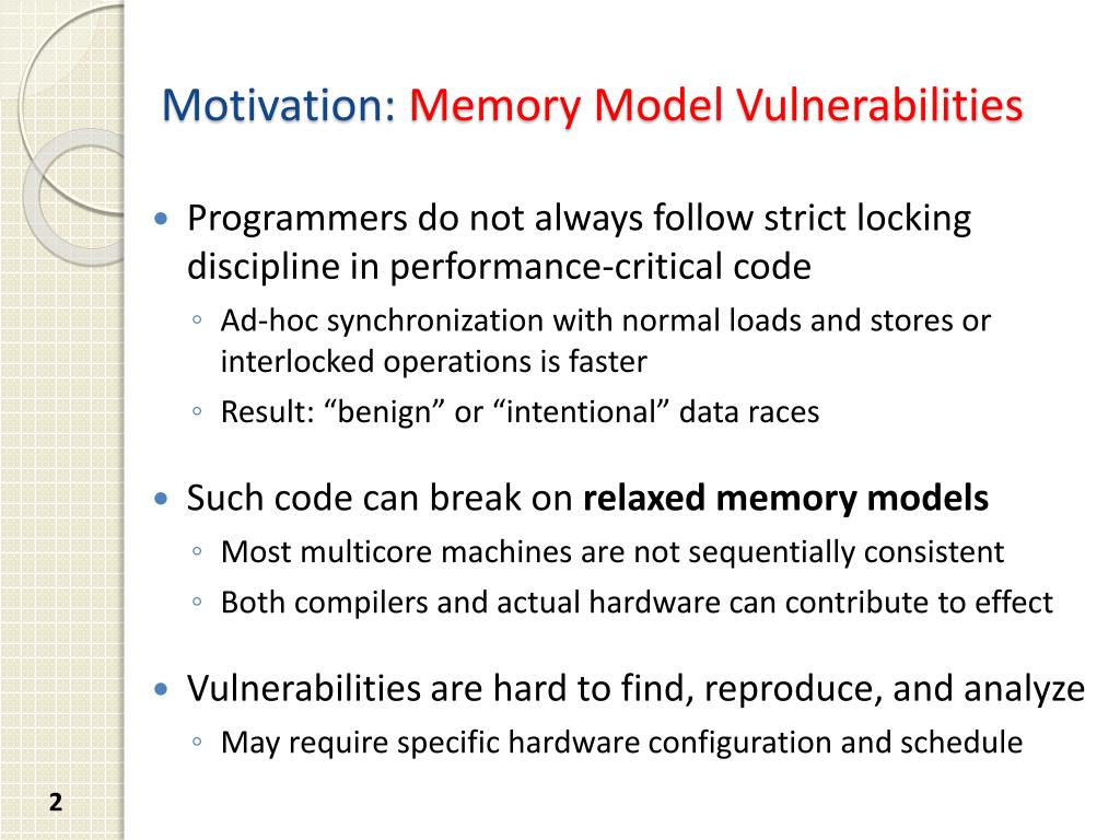 Motivation: Memory Model Vulnerabilities • Programmers do not always follow strict locking discipline in performance-critical code • Ad-hoc synchronization with normal loads and stores or interlocked operations is faster • Result: “benign” or “intentional” data races • Such code can break on relaxed memory models • Most multicore machines are not sequentially consistent • Both compilers and actual hardware can contribute to effect • Vulnerabilities are hard to find, reproduce, and analyze • May require specific hardware configuration and schedule