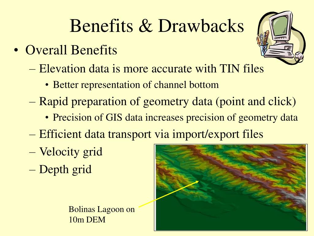 Benefits & Drawbacks • Overall Benefits • Elevation data is more accurate with TIN files • Better representation of channel bottom • Rapid preparation of geometry data (point and click) • Precision of GIS data increases precision of geometry data • Efficient data transport via import/export files • Velocity grid • Depth grid Bolinas Lagoon on 10m DEM