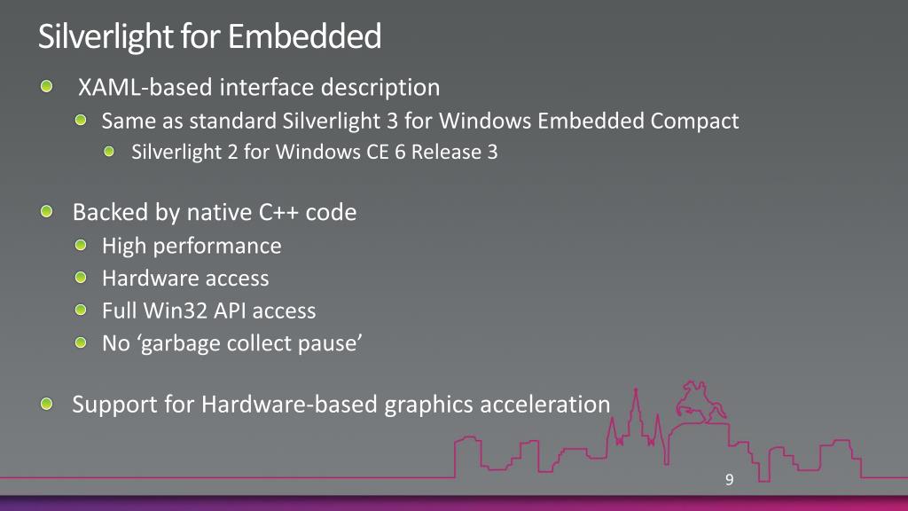 Silverlight for Embedded • XAML-based interface description • Same as standard Silverlight 3 for Windows Embedded Compact • Silverlight 2 for Windows CE 6 Release 3 • Backed by native C++ code • High performance • Hardware access • Full Win32 API access • No ‘garbage collect pause’ • Support for Hardware-based graphics acceleration