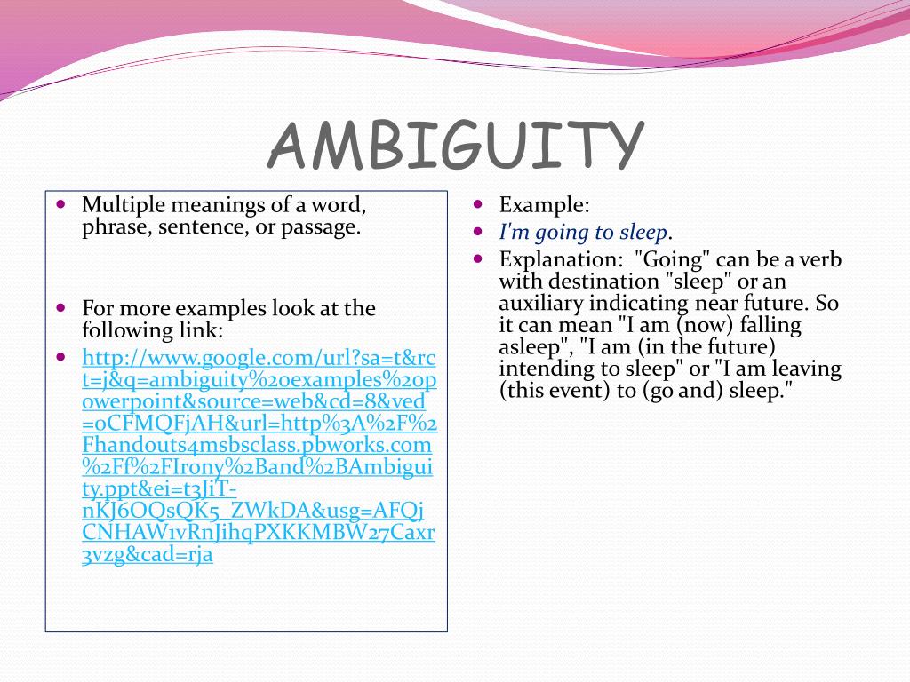 AMBIGUITY • Multiple meanings of a word, phrase, sentence, or passage. • For more examples look at the following link: • http://www.google.com/url?sa=t&rct=j&q=ambiguity%20examples%20powerpoint&source=web&cd=8&ved=0CFMQFjAH&url=http%3A%2F%2Fhandouts4msbsclass.pbworks.com%2Ff%2FIrony%2Band%2BAmbiguity.ppt&ei=t3JiT-nKJ6OQsQK5_ZWkDA&usg=AFQjCNHAW1vRnJihqPXKKMBW27Caxr3vzg&cad=rja • Example: • I'm going to sleep. • Explanation: "Going" can be a verb with destination "sleep" or an auxiliary indicating near future. So it can mean "I am (now) falling asleep", "I am (in the future) intending to sleep" or "I am leaving (this event) to (go and) sleep."