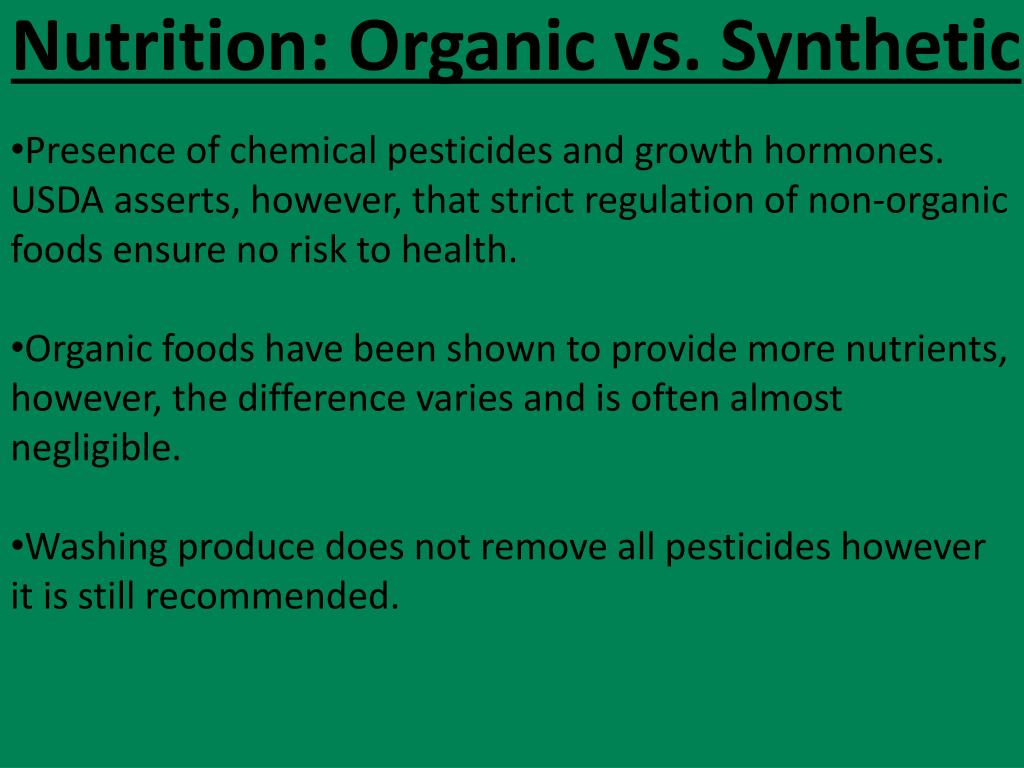 Nutrition: Organic vs. Synthetic • Presence of chemical pesticides and growth hormones. USDA asserts, however, that strict regulation of non-organic foods ensure no risk to health. • Organic foods have been shown to provide more nutrients, however, the difference varies and is often almost negligible. • Washing produce does not remove all pesticides however it is still recommended.