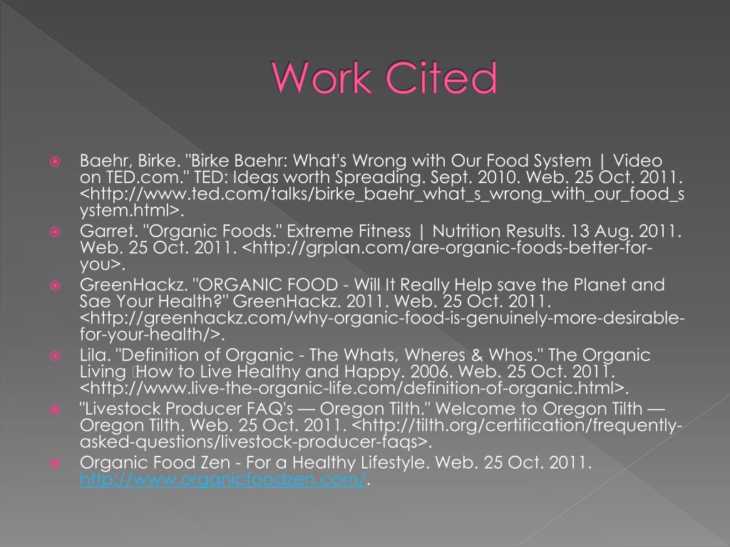 Work Cited • Baehr, Birke. "BirkeBaehr: What's Wrong with Our Food System | Video on TED.com." TED: Ideas worth Spreading. Sept. 2010. Web. 25 Oct. 2011. <http://www.ted.com/talks/birke_baehr_what_s_wrong_with_our_food_system.html>. • Garret. "Organic Foods." Extreme Fitness | Nutrition Results. 13 Aug. 2011. Web. 25 Oct. 2011. <http://grplan.com/are-organic-foods-better-for-you>. • GreenHackz. "ORGANIC FOOD - Will It Really Help save the Planet and Sae Your Health?" GreenHackz. 2011. Web. 25 Oct. 2011. <http://greenhackz.com/why-organic-food-is-genuinely-more-desirable-for-your-health/>. • Lila. "Definition of Organic - The Whats, Wheres & Whos." The Organic Living How to Live Healthy and Happy. 2006. Web. 25 Oct. 2011. <http://www.live-the-organic-life.com/definition-of-organic.html>. • "Livestock Producer FAQ's — Oregon Tilth." Welcome to Oregon Tilth — Oregon Tilth. Web. 25 Oct. 2011. <http://tilth.org/certification/frequently-asked-questions/livestock-producer-faqs>. • Organic Food Zen - For a Healthy Lifestyle. Web. 25 Oct. 2011. http://www.organicfoodzen.com/.