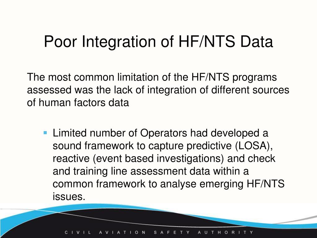 Poor Integration of HF/NTS Data The most common limitation of the HF/NTS programs assessed was the lack of integration of different sources of human factors data • Limited number of Operators had developed a sound framework to capture predictive (LOSA), reactive (event based investigations) and check and training line assessment data within a common framework to analyse emerging HF/NTS issues.