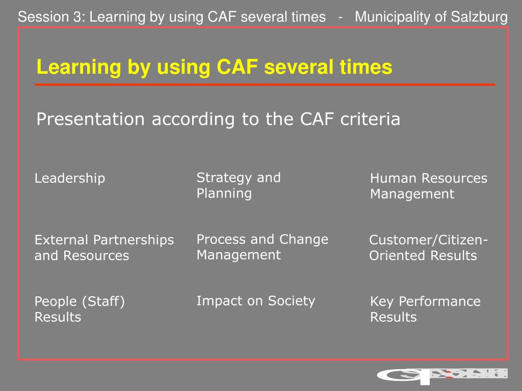 Learning by using CAF several times Presentation according to the CAF criteria Strategy and Planning Leadership Human Resources Management Process and ChangeManagement External Partnerships and Resources Customer/Citizen-Oriented Results Impact on Society People (Staff)Results Key PerformanceResults