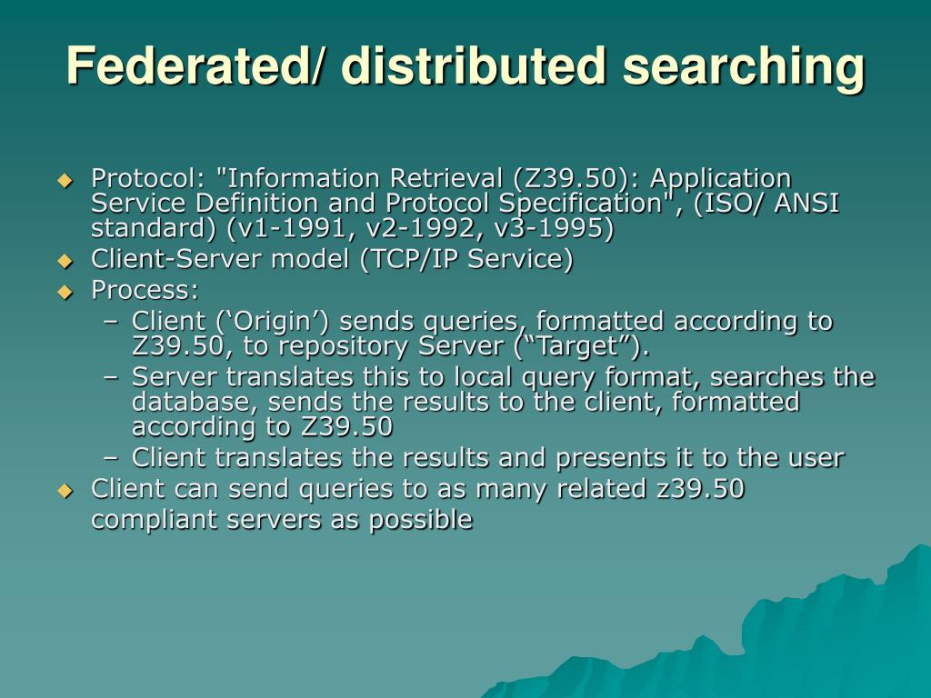 Federated/ distributed searching Protocol: "Information Retrieval (Z39.50): Application Service Definition and Protocol Specification", (ISO/ ANSI standard) (v1-1991, v2-1992, v3-1995) Client-Server model (TCP/IP Service) Process: • Client (‘Origin’) sends queries, formatted according to Z39.50, to repository Server (“Target”). • Server translates this to local query format, searches the database, sends the results to the client, formatted according to Z39.50 • Client translates the results and presents it to the user Client can send queries to as many related z39.50 compliant servers as possible