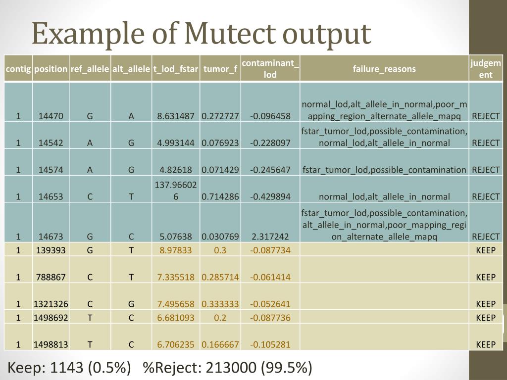 Example of Mutect output Keep: 1143 (0.5%) %Reject: 213000 (99.5%)
