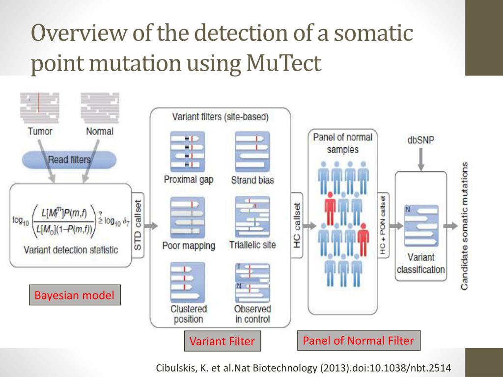 Overview of the detection of a somatic point mutation using MuTect Bayesian model Panel of Normal Filter Variant Filter Cibulskis, K. et al.NatBiotechnology (2013).doi:10.1038/nbt.2514