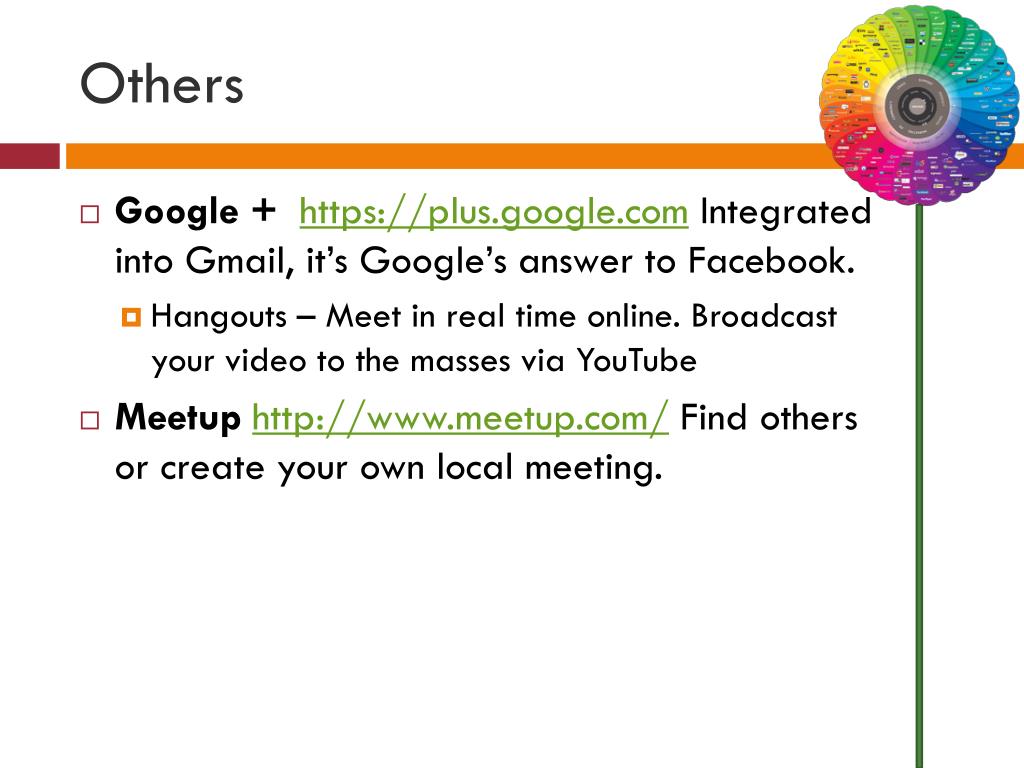 Others • Google + https://plus.google.com Integrated into Gmail, it’s Google’s answer to Facebook. • Hangouts – Meet in real time online. Broadcast your video to the masses via YouTube • Meetuphttp://www.meetup.com/ Find others or create your own local meeting.