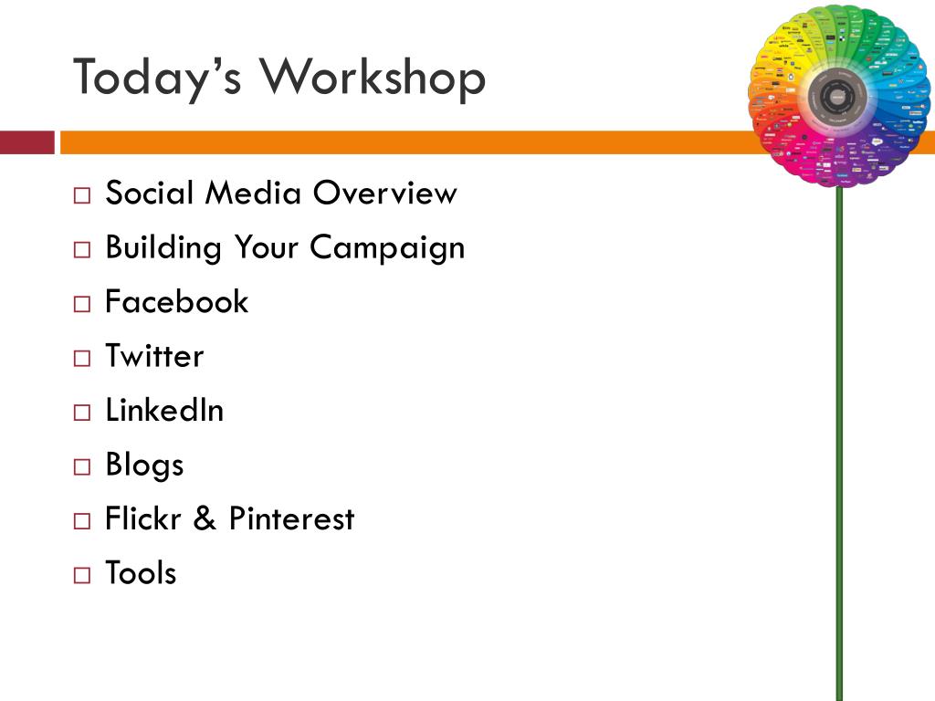 Today’s Workshop • Social Media Overview • Building Your Campaign • Facebook • Twitter • LinkedIn • Blogs • Flickr & Pinterest • Tools