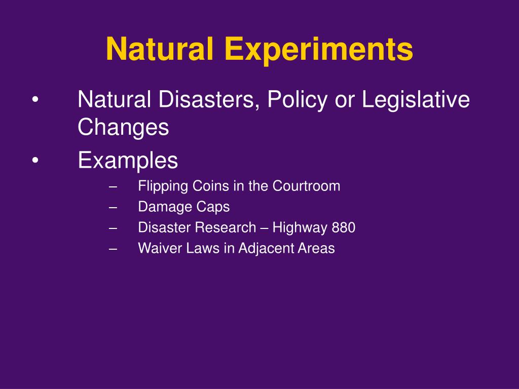 Natural Experiments • Natural Disasters, Policy or Legislative Changes • Examples • Flipping Coins in the Courtroom • Damage Caps • Disaster Research – Highway 880 • Waiver Laws in Adjacent Areas