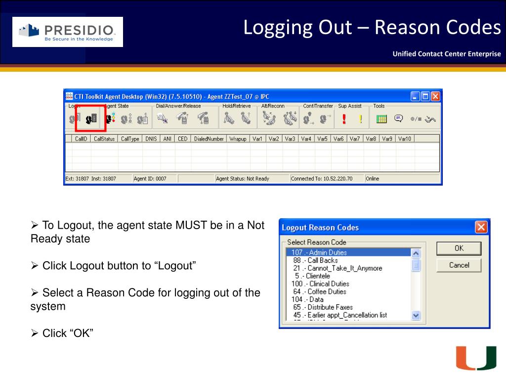 Logging Out – Reason Codes • To Logout, the agent state MUST be in a Not Ready state • Click Logout button to “Logout” • Select a Reason Code for logging out of the system • Click “OK”