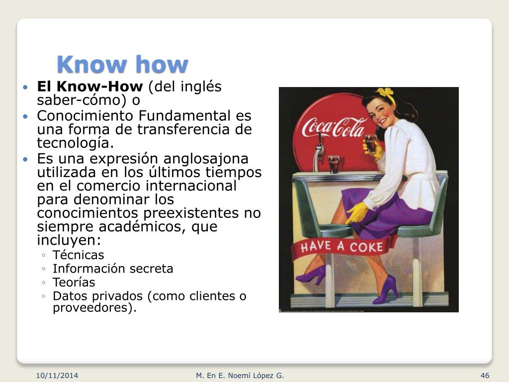 Knowhow El Know-How(del inglés saber-cómo) o Conocimiento Fundamental es una forma de transferencia de tecnología. Es una expresión anglosajona utilizada en los últimos tiempos en el comercio internacional para denominar los conocimientos preexistentes no siempre académicos, que incluyen: Técnicas Información secreta Teorías Datos privados (como clientes o proveedores). M. En E. Noemí López G.