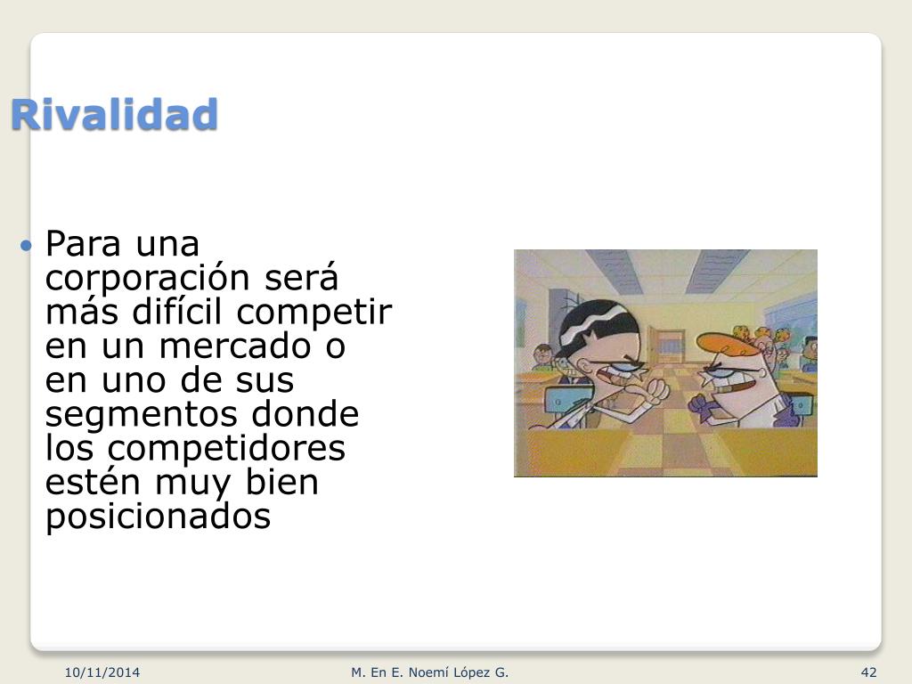 Rivalidad Para una corporación será más difícil competir en un mercado o en uno de sus segmentos donde los competidores estén muy bien posicionados M. En E. Noemí López G.
